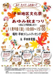 2025年11月9日(日)平田コミュニティセンター&平田体育館にて10:00~15:00の時間帯で平田地区文化祭&あゆみ秋祭りを開催します。